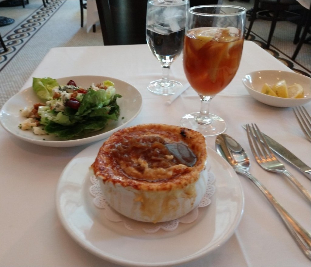 After I rested up, I headed for the Paris Casino where they had an Eiffel Tower. I had lunch under the Eiffel tower at a French restaurant. I had French onion soup and a side salad.