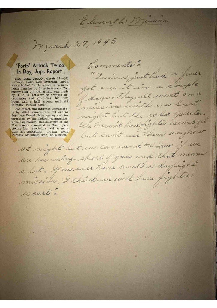 “He says some of the crew were sick, but well enough to fly. He says they bombed someplace called Kyushu.”