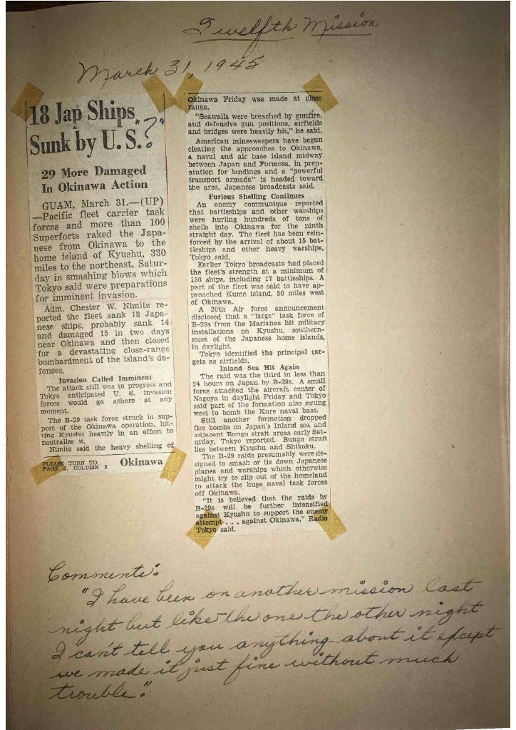 It is strange that he says he can’t say anything about it, but then attaches an article about it. He did this just before the Battle of Iwo Jima started too. The date of this mission was one day before the Battle of Okinawa started.