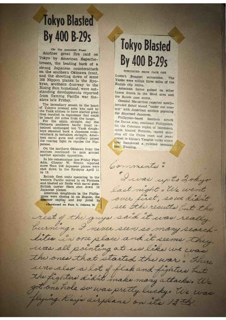 “Hey sis, I got another letter from Andy. He says there were a lot of search lights, and they got a bullet hole in their plane.”