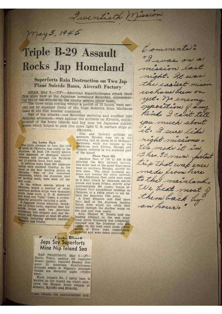 I suspect dad’s plane dropped the mines in the Japanese Nippon harbor. The navy was starting to plan a naval bombardment of Honshu on the main Japanese island. The battle of Okinawa was still raging. The first atomic bomb would not be tested until July 16th, 1945. So, the army and navy were still planning on invading Japan.
